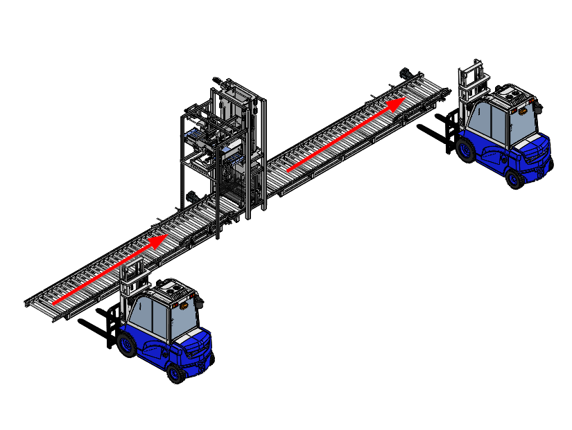 Maszyna służąca do napełniania warzywami lub owocami koszy (binów). Wymiar napełnianego kosza wynosi 600x800x1000 mm. Kosze są automatycznie przemieszczane na przenośnikach rokowych.